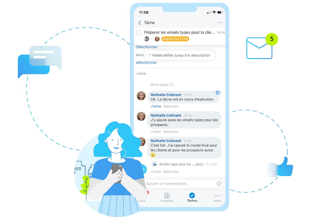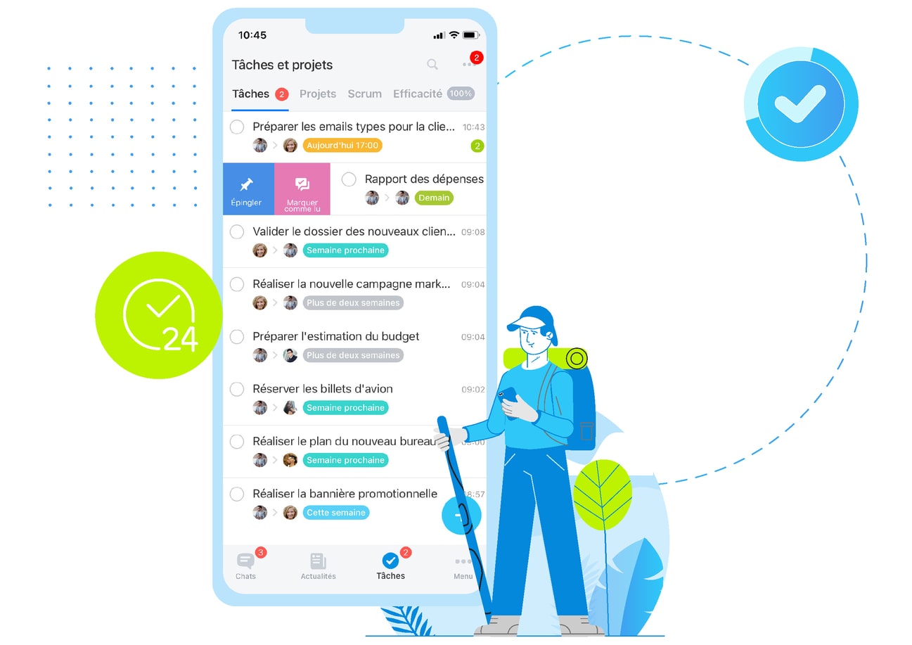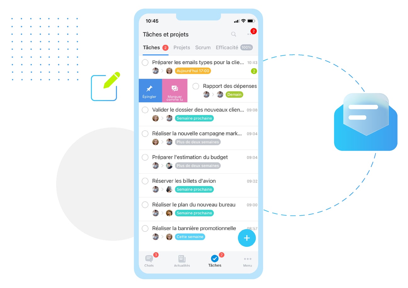 Postez vos commentaires au sein des tâches, comme si vous étiez sur un chat. Épinglez les tâches importantes en haut de votre liste pour ne râter aucune évolution. Faites attention aux compteurs rouges qui indiquent les tâches qui sont en retard. Toutes les notifications des tâches sont affichées au même endroit pour faciliter la lisibilité.