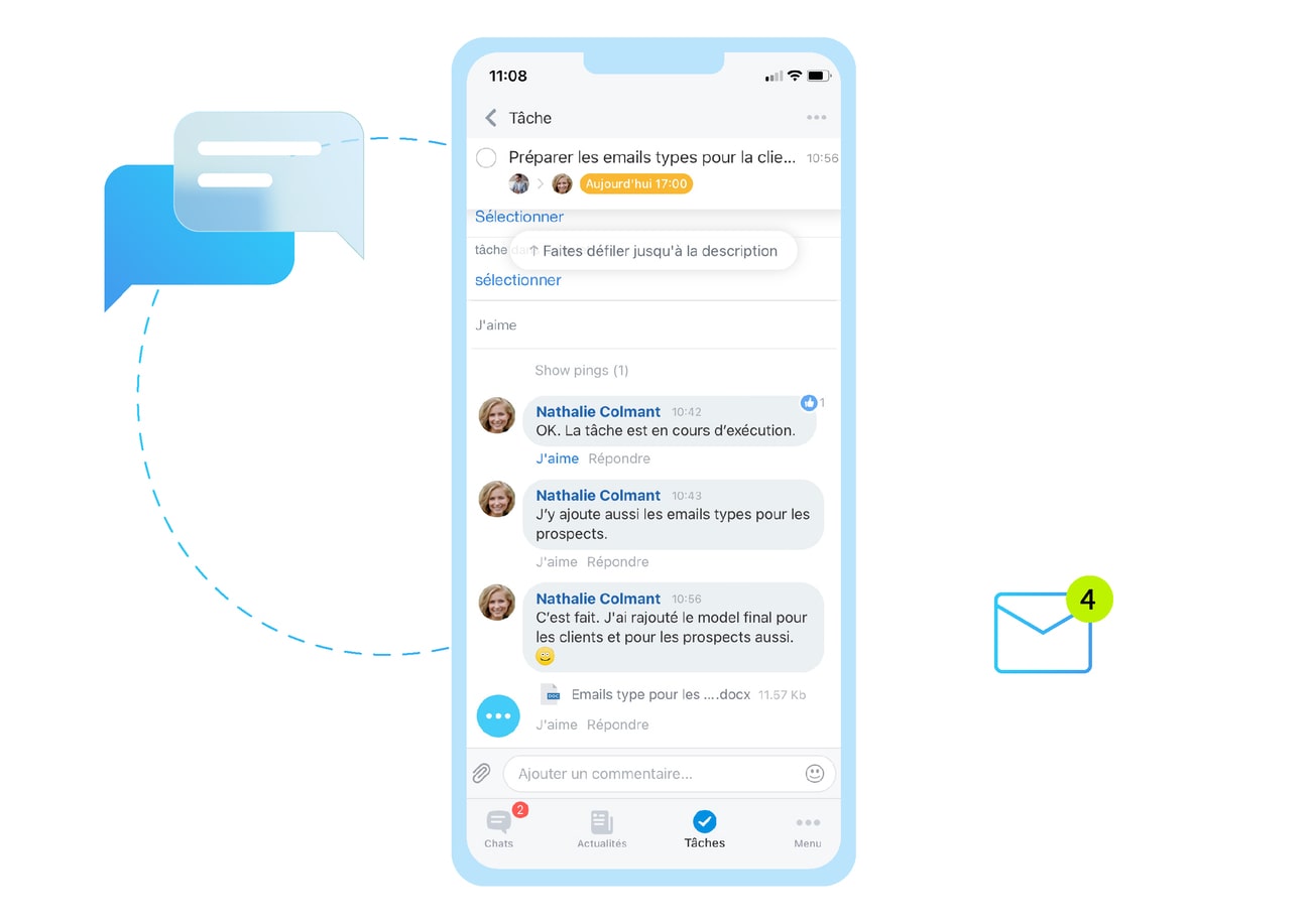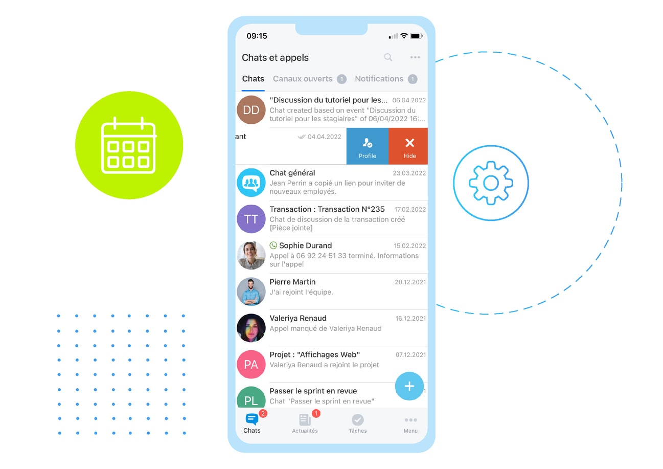 Joignez rapidement n'importe quel membre de votre équipe via un chat, un appel téléphonique ou un appel vidéo.