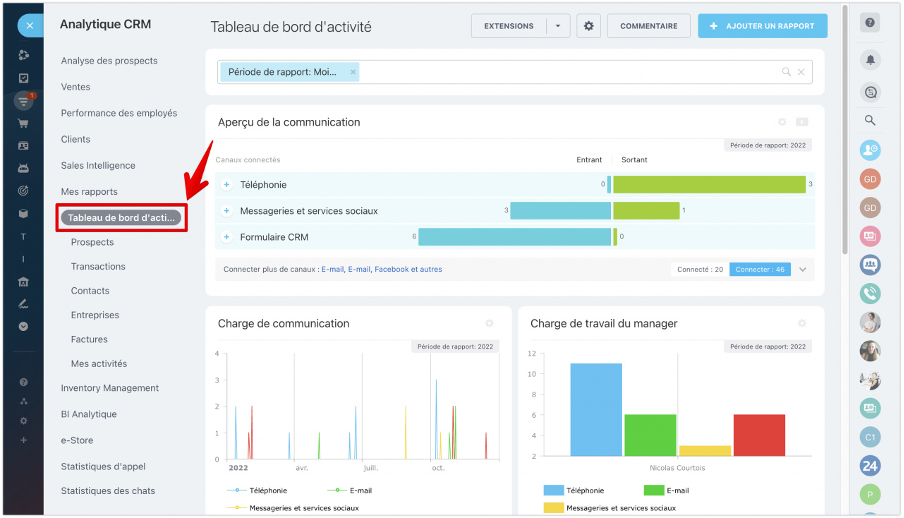 Le tableau de bord de Bitrix24 est également personnalisable, ce qui signifie que les utilisateurs peuvent configurer leurs propres KPI et graphiques pour répondre aux besoins spécifiques de leur entreprise. Les données peuvent être filtrées par service, par projet ou par employé, ce qui permet une analyse plus fine des performances.