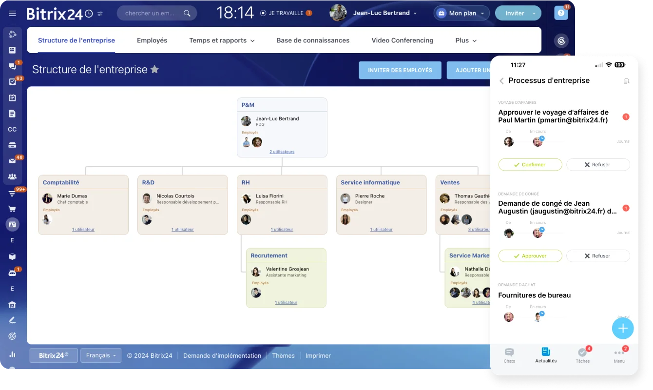 Bitrix24 est un espace de travail en ligne pour toute l'équipe. En plus de l'automatisation de la force de vente, il comprend également les fonctions suivantes :