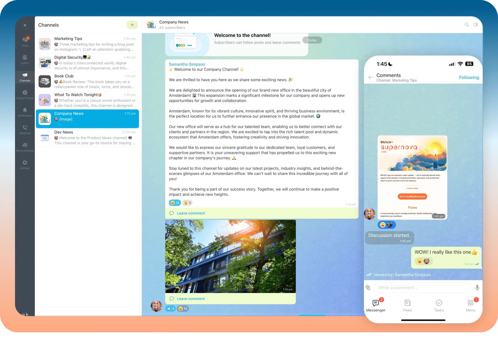 Les chaînes offrent de nouvelles façons de communiquer dans Bitrix24, tant au niveau de l'entreprise qu'au niveau informel. Créez une chaîne pour les annonces de l'entreprise, pour l'intégration des employés ou pour les actualités de l'industrie afin de partager des informations de manière organique et attrayante.