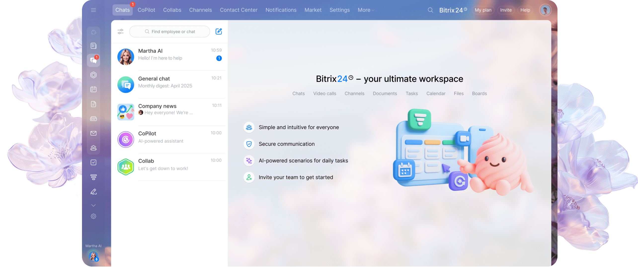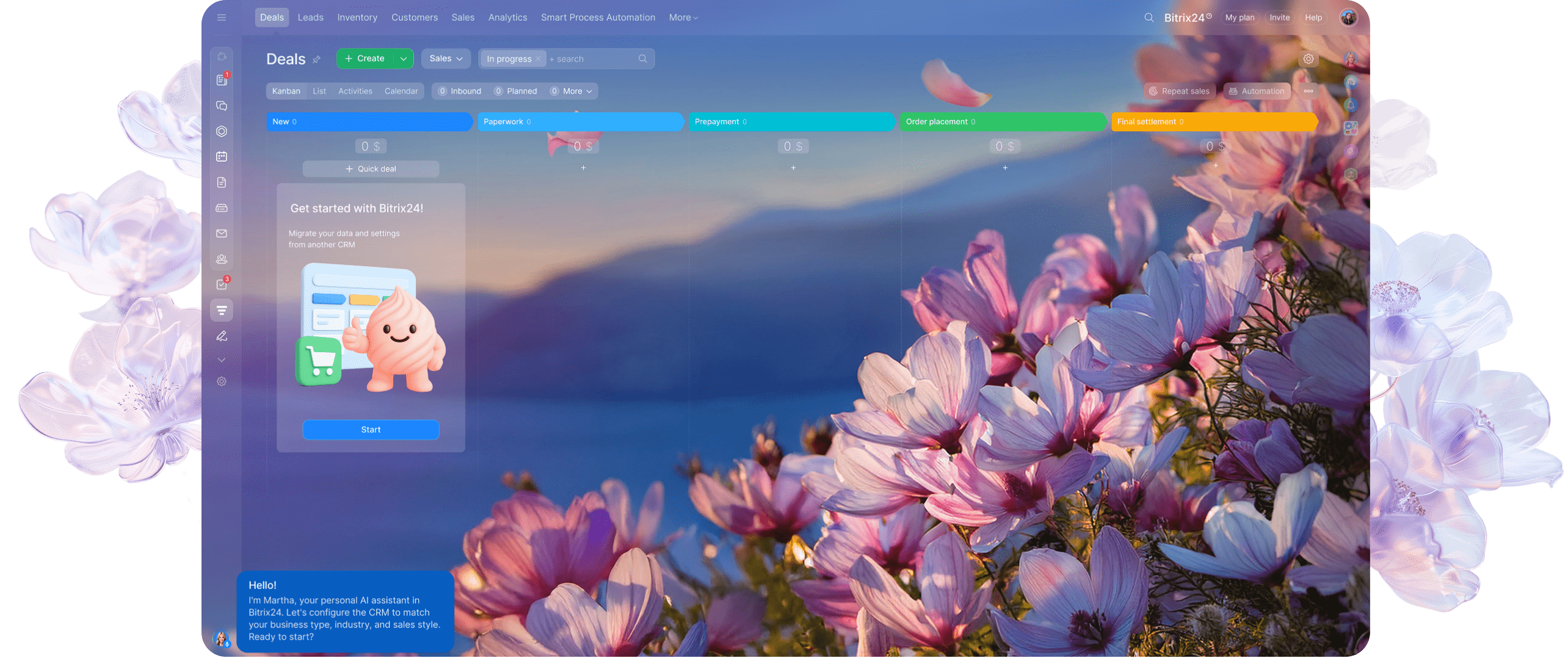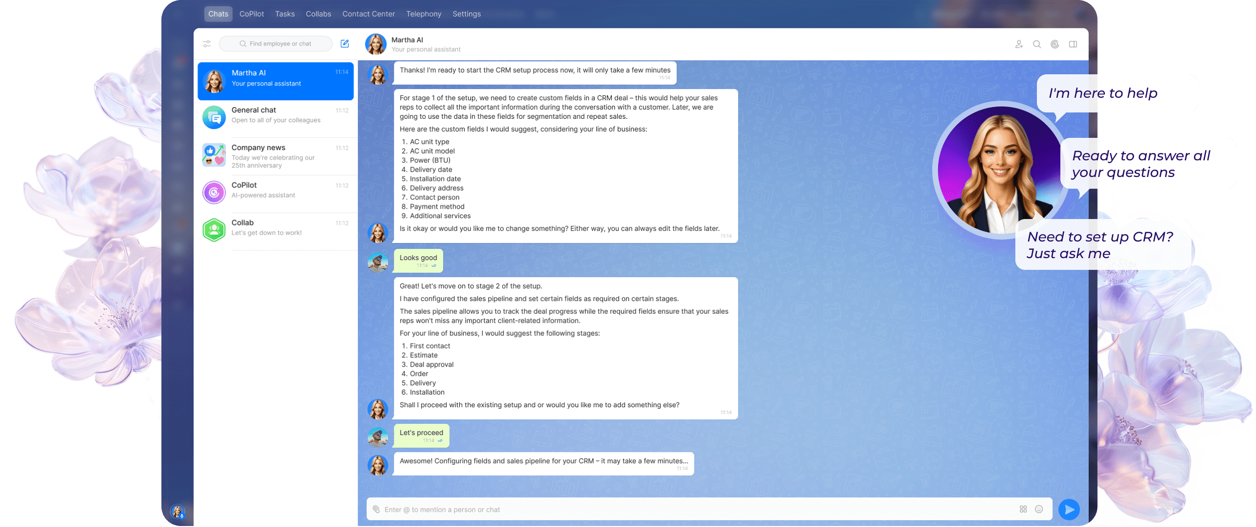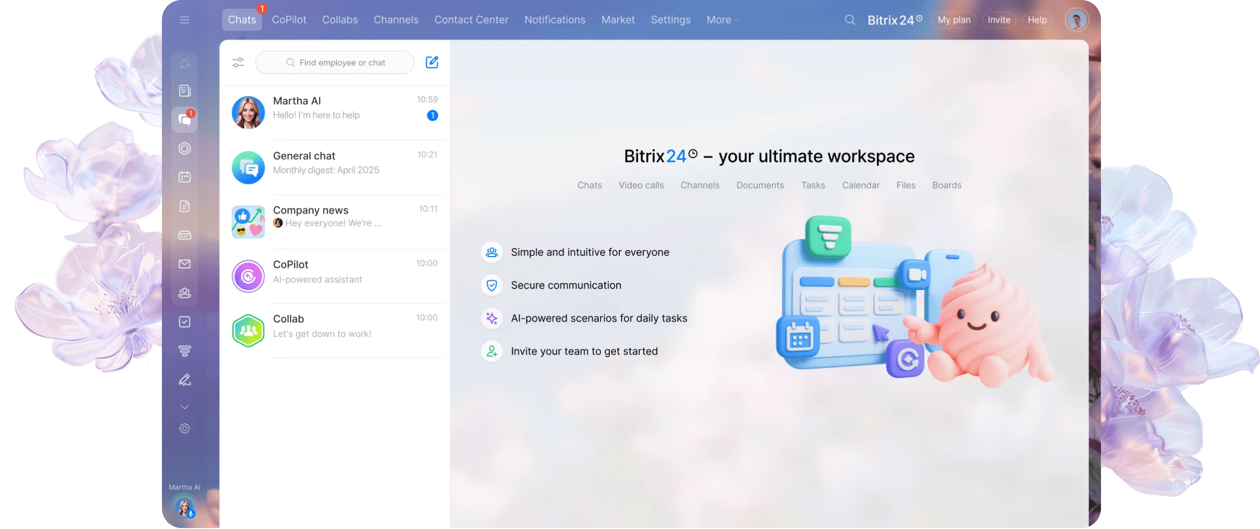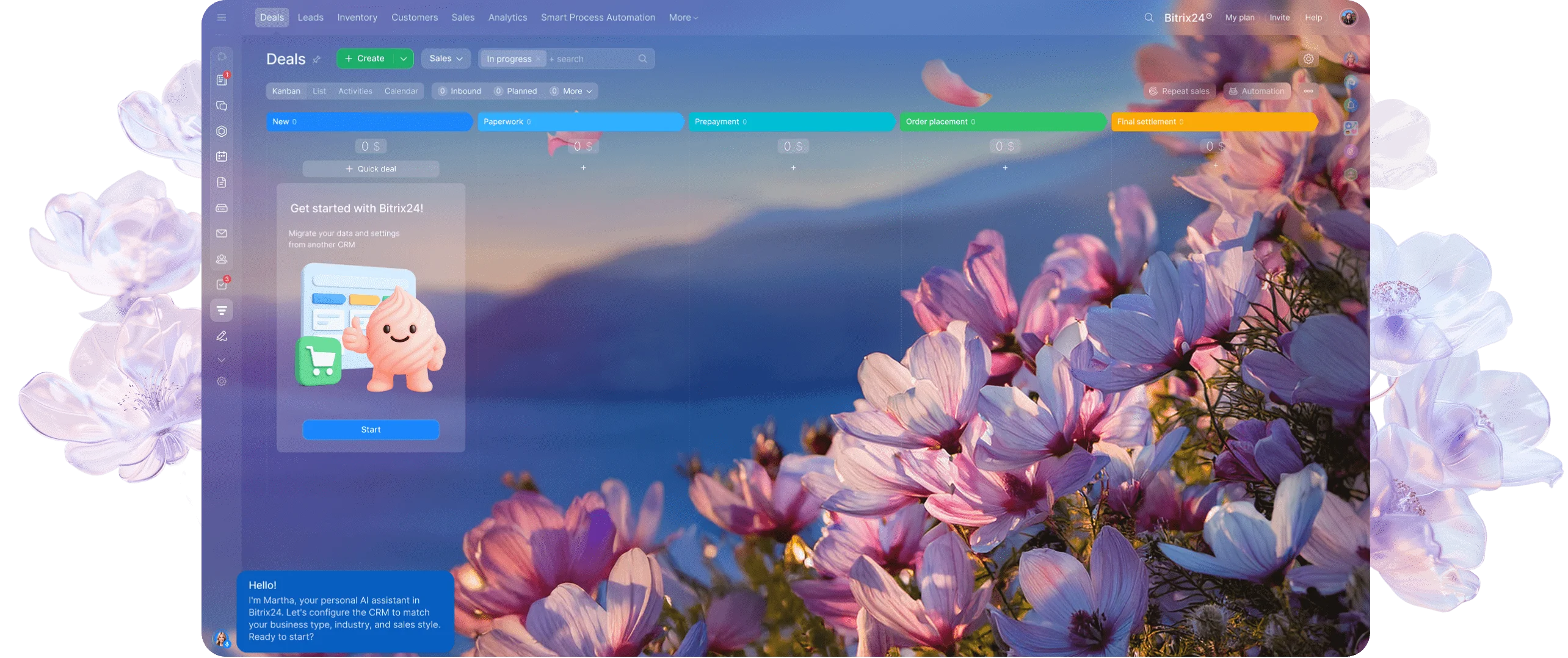 Martha est votre nouvelle partenaire pour faire avancer les choses. De l'intégration des produits à la programmation quotidienne et à la configuration des outils, cette assistante alimentée par l'IA est là pour réduire votre charge de travail et vous aider, vous et votre équipe, à naviguer facilement dans Bitrix24.