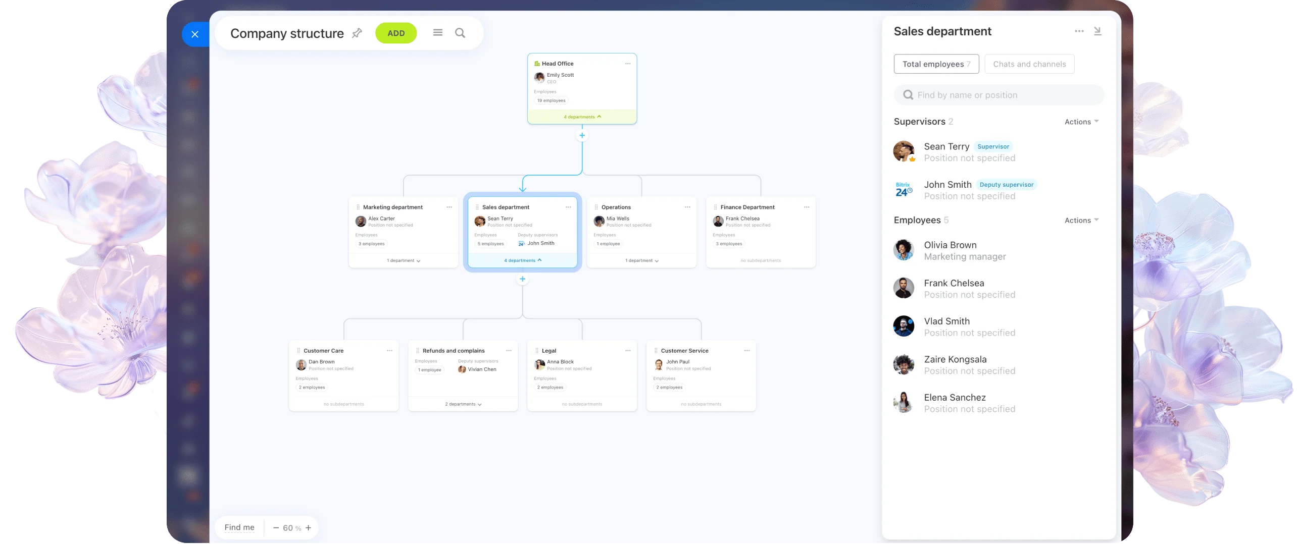 Visualisez et modifiez la structure de votre entreprise dans un organigramme interactif. Déplacez par glisser-déposer des employés, des départements ou des rôles pour refléter instantanément la structure réelle de votre équipe.