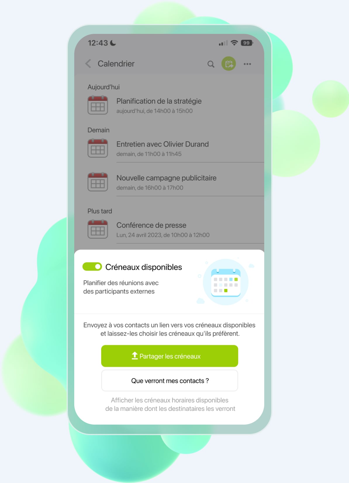 Facile à utiliser : envoyez un lien de votre calendrier par email, messagerie ou SMS