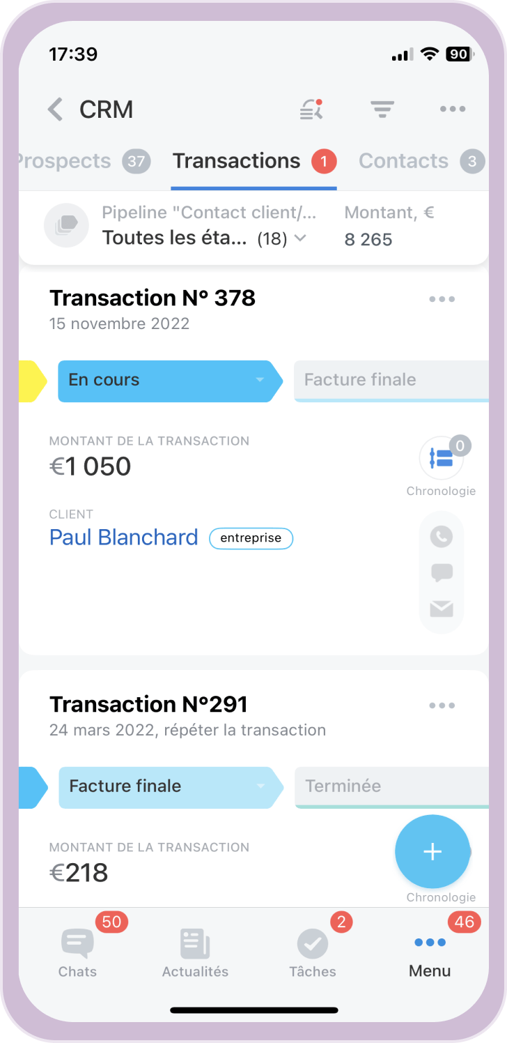 Travaillez avec vos prospects depuis votre smartphone (créez des étapes personnalisées, des formulaires et des champs), convertissez vos prospects en transactions, contacts ou entreprises.