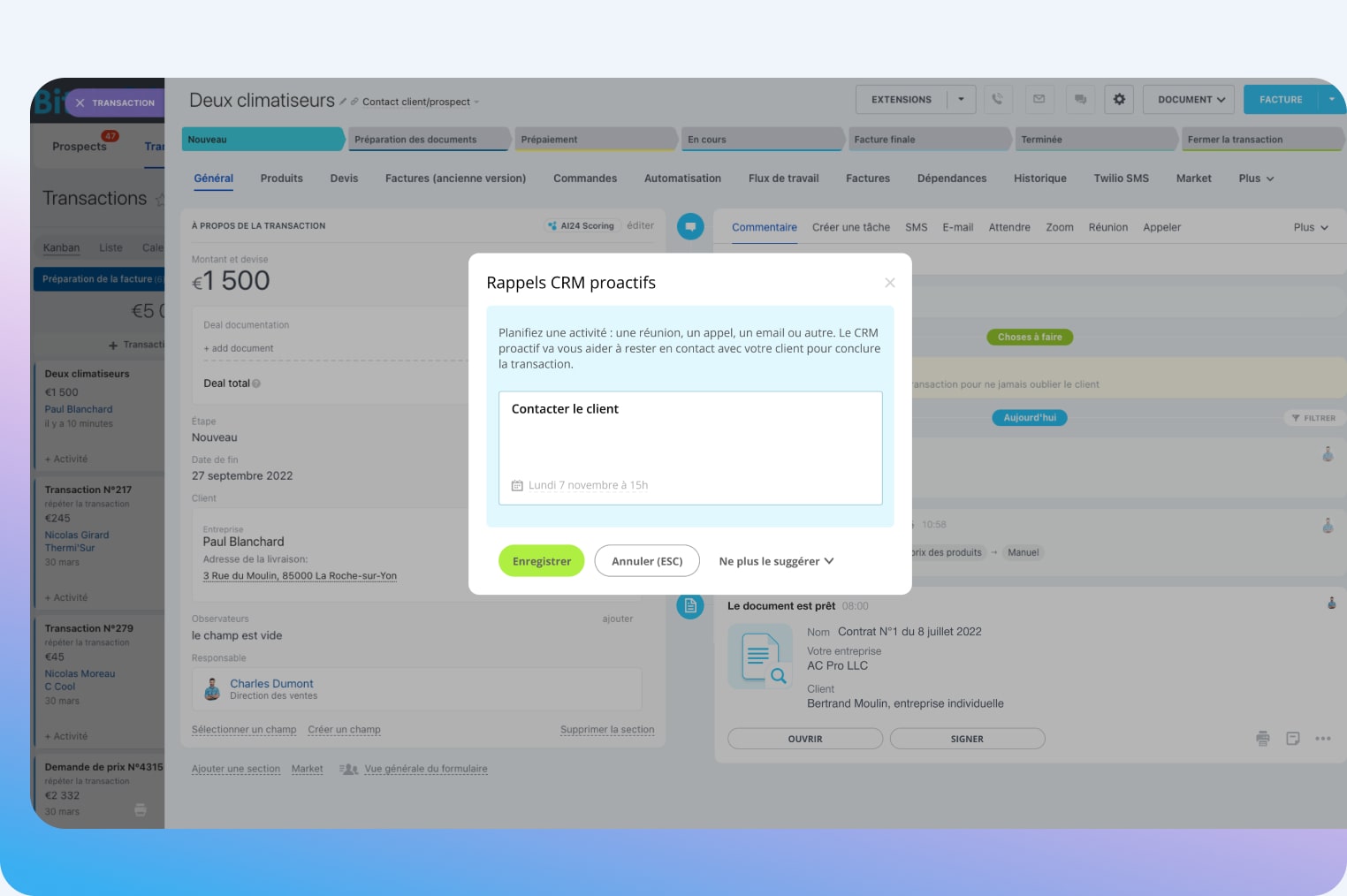 Signez vos documents directement depuis le CRM (tous les champs nécessaires sont remplis automatiquement avec les informations issues de la transaction)