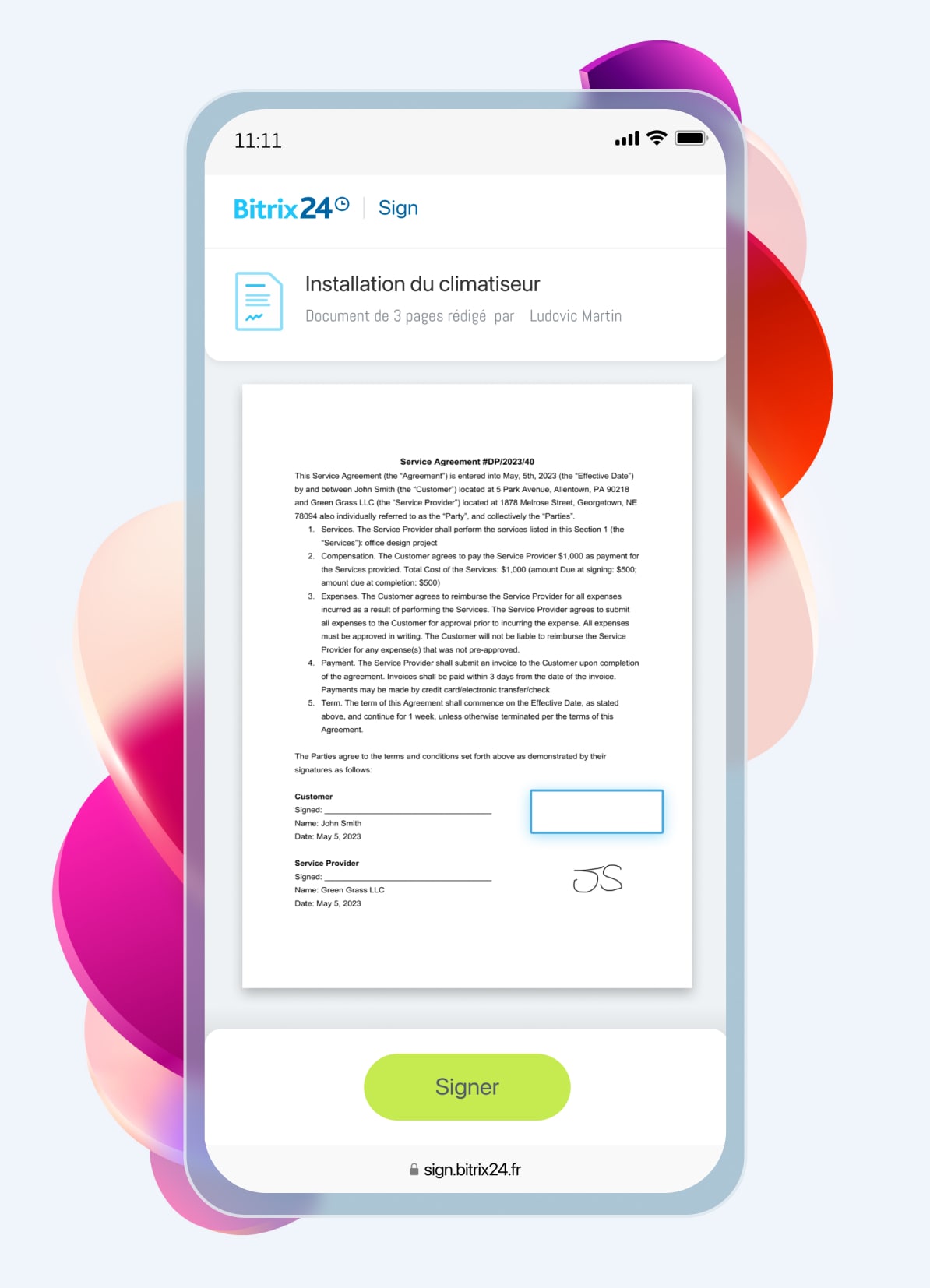 Le nouvel outil d'e-signature de Bitrix24 vous permettra de faire signer n'importe quel document en ligne rapidement et facilement, depuis votre CRM. C'est peut être le petit coup de pouce final qu'il manquait pour faire valider un devis et conclure une vente.