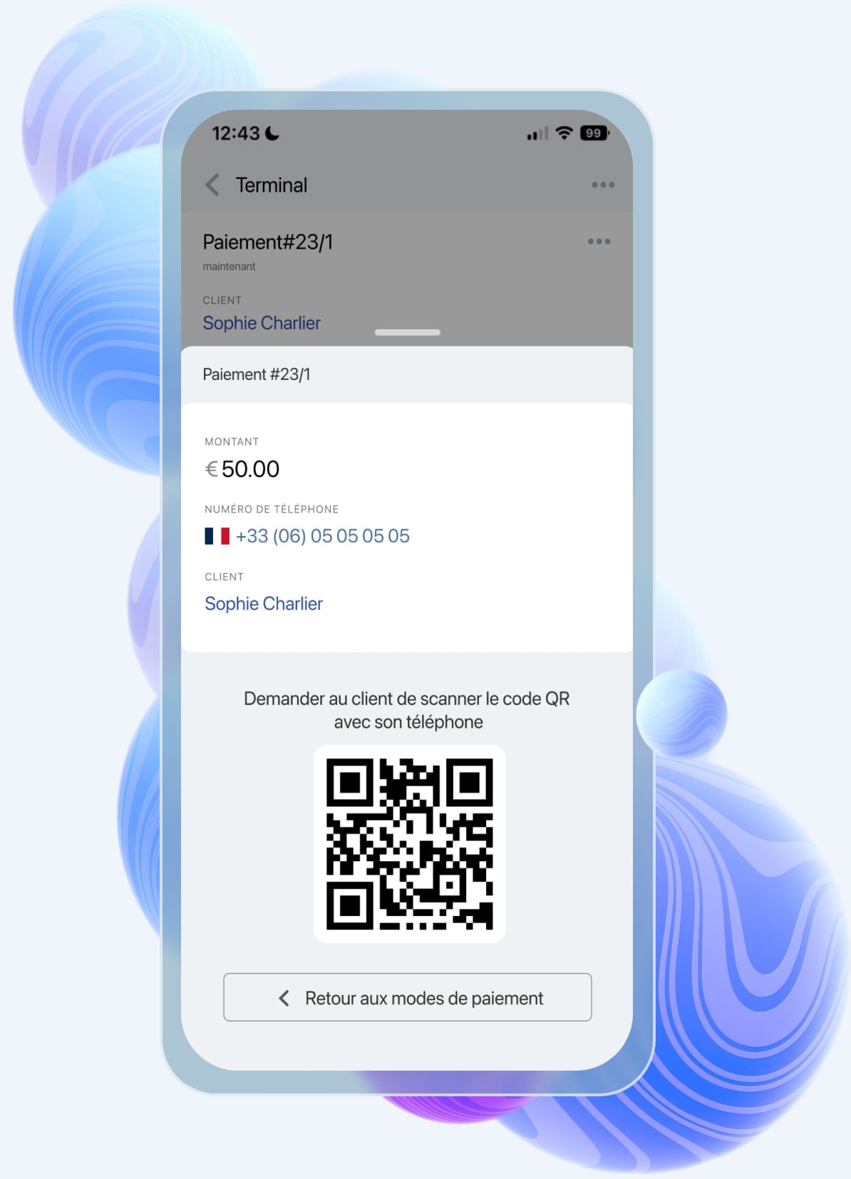 Le client scanne le code avec leur smartphone et sera dirigé vers la page de paiement