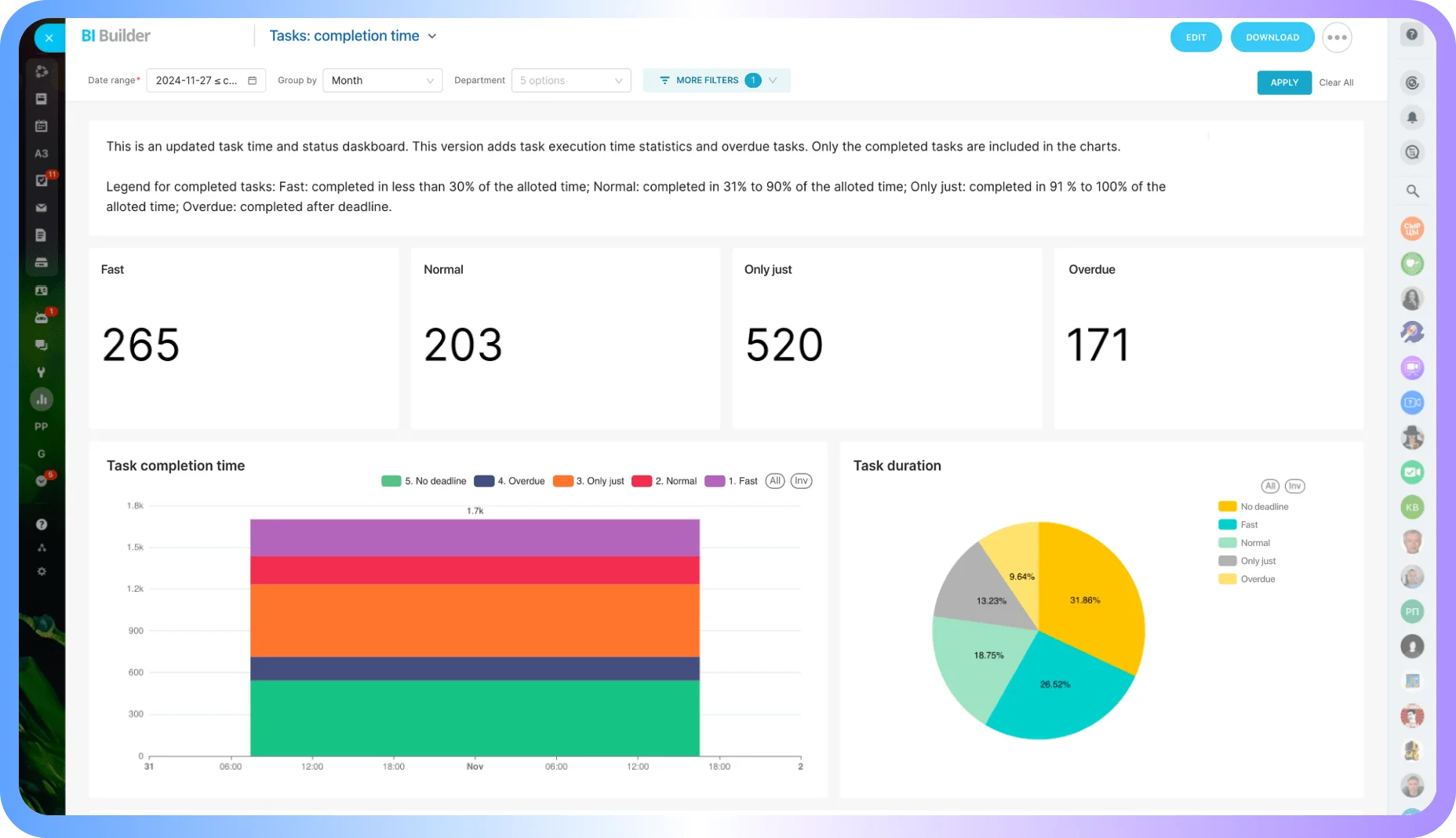 De nouveaux tableaux de bord sont désormais disponibles dans BI Builder : créez des rapports sur l'efficacité des employés et la participation aux tâches. En outre, vous pouvez désormais télécharger vos propres données au format CSV dans BI Builder.