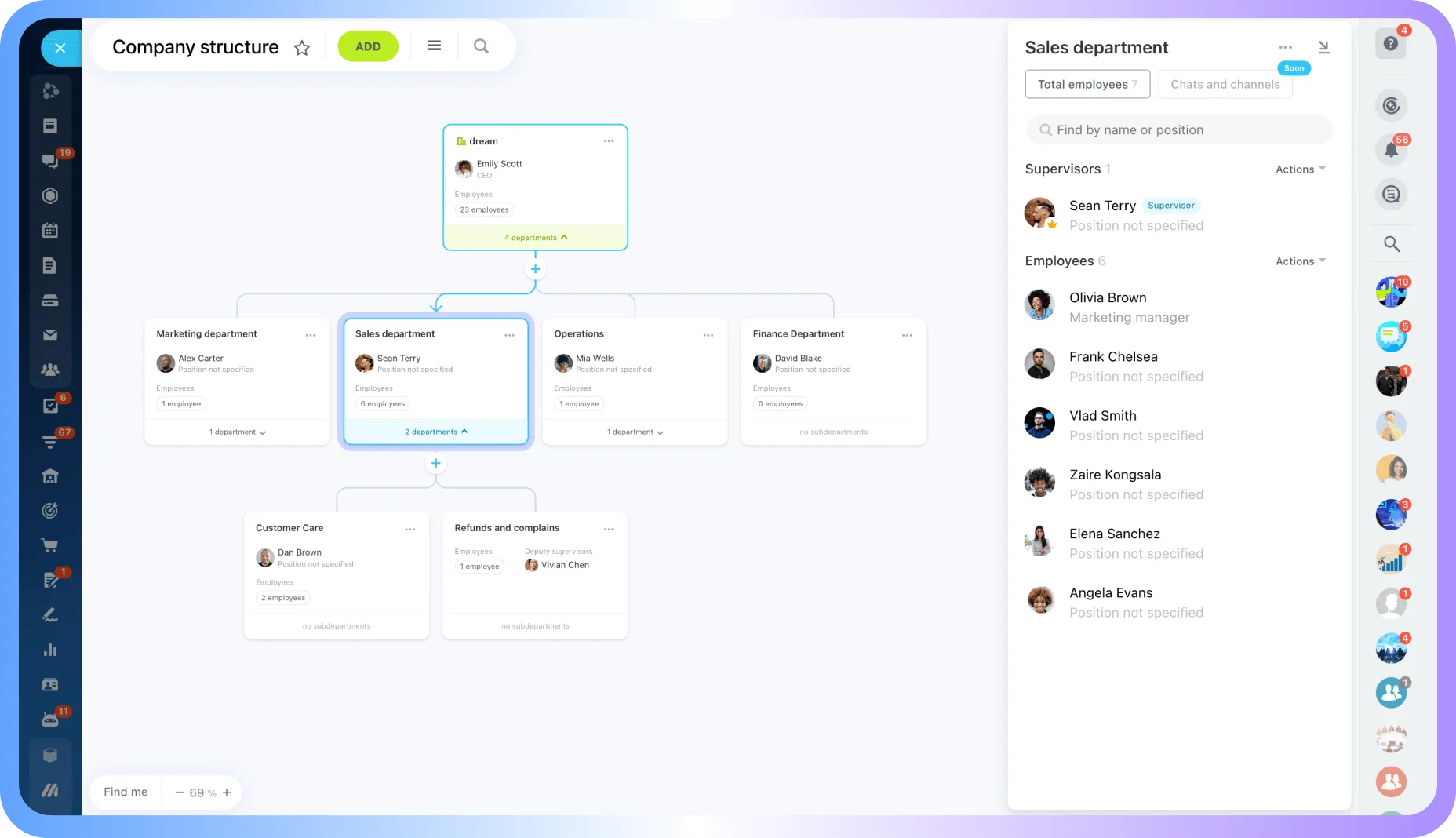 Créez des départements et des sous-départements, ajoutez des employés et déplacez-les d'un poste à l'autre. Certaines parties de la structure peuvent être masquées pour des raisons de sécurité ou d'autres raisons liées à l'entreprise.