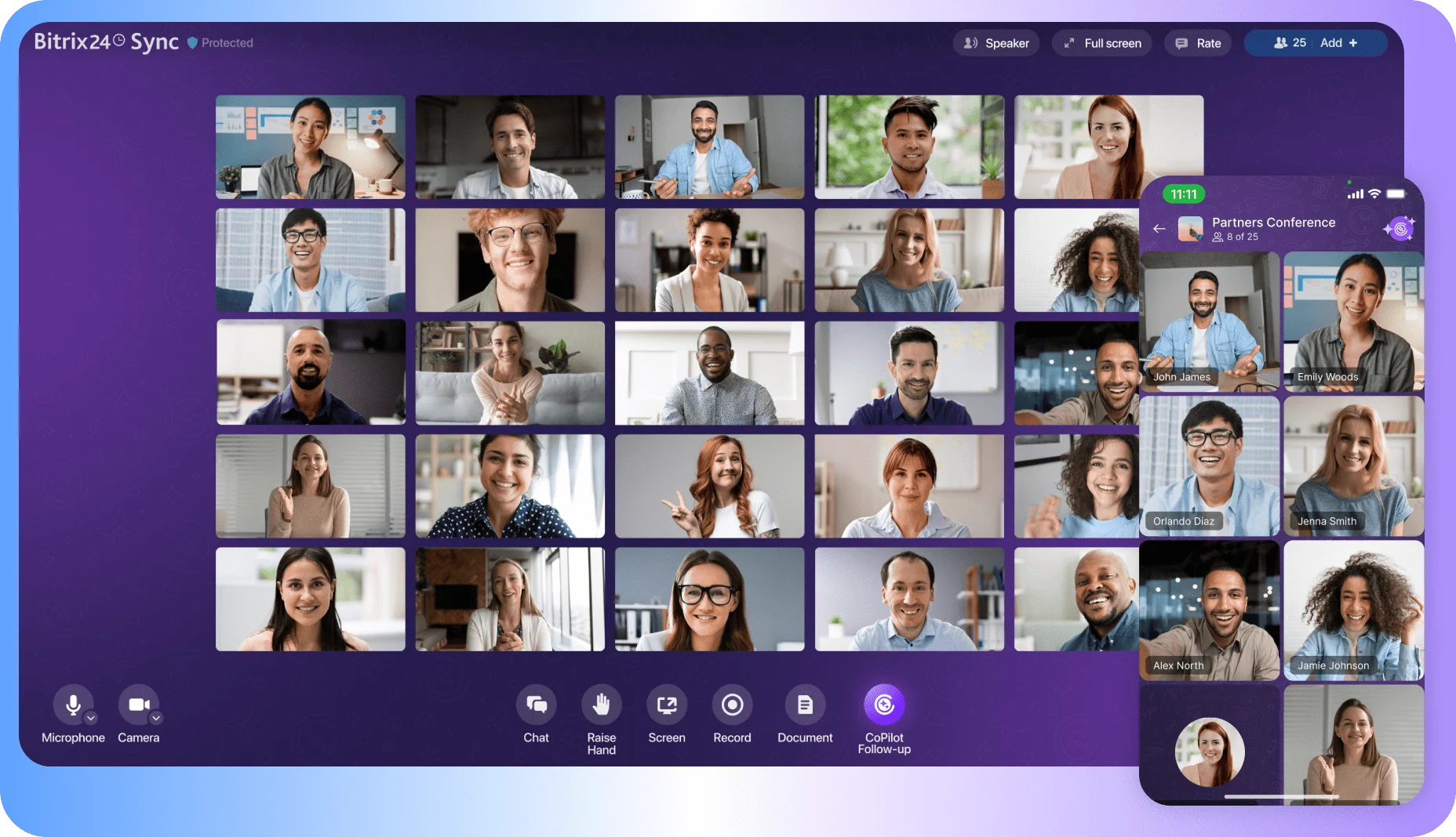 Avec des performances améliorées, notre Bitrix24 Sync vous permet d'avoir jusqu'à 1 000 participants sur le même appel tout en maintenant une haute qualité d'image, en particulier pendant le partage d'écran.
