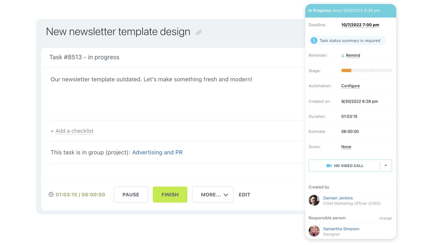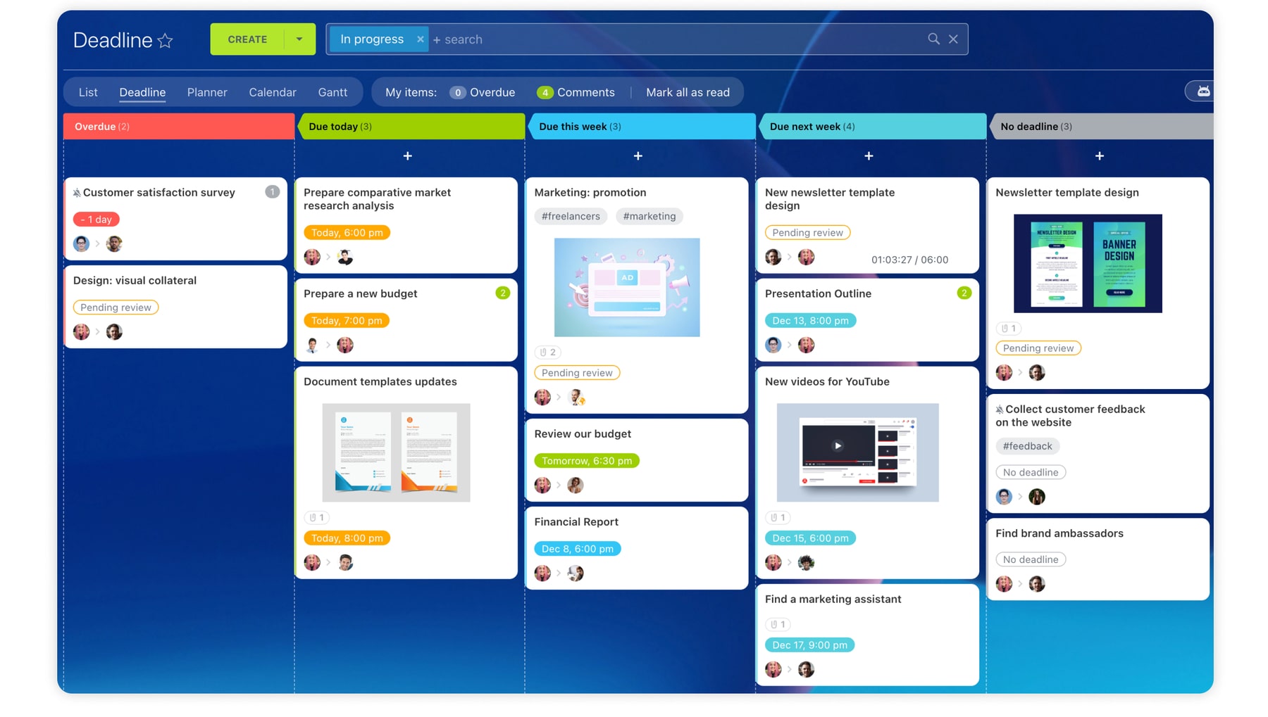 L'outil de gestion de projet facilite le travail des personnes qui attribuent des tâches. Pour les tâches récurrentes, utilisez les paramètres automatisés pour définir des tâches quotidiennes, hebdomadaires, mensuelles ou personnalisées. Communiquez dans les tâches pour vérifier l'avancement ou utilisez le chat pour équilibrer les charges de travail. Les chefs de projet peuvent voir la charge de travail des membres de l'équipe et réaffecter les tâches si nécessaire.