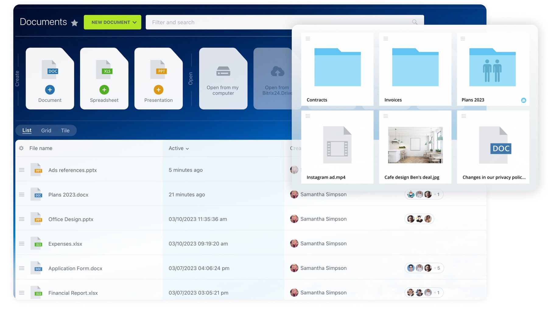Stockez tous les fichiers de l'entreprise en un seul endroit. Organisez mieux votre entreprise grâce à des droits d'accès personnalisables. Marquez tous les fichiers et trouvez ce dont vous avez besoin plus rapidement grâce à un moteur de recherche numérique. Avec l'option de stockage dans le nuage de Bitrix24, accédez à vos fichiers de n'importe où, même pendant les rencontres avec les clients. Un autre avantage du partage et du stockage des fichiers est la possibilité de réduire les coûts liés au papier et à l'espace de stockage. Les entreprises peuvent également fournir un accès limité aux clients pour le partage de certains fichiers, ce qui permet de désencombrer les boîtes de réception et de rationaliser certains processus.