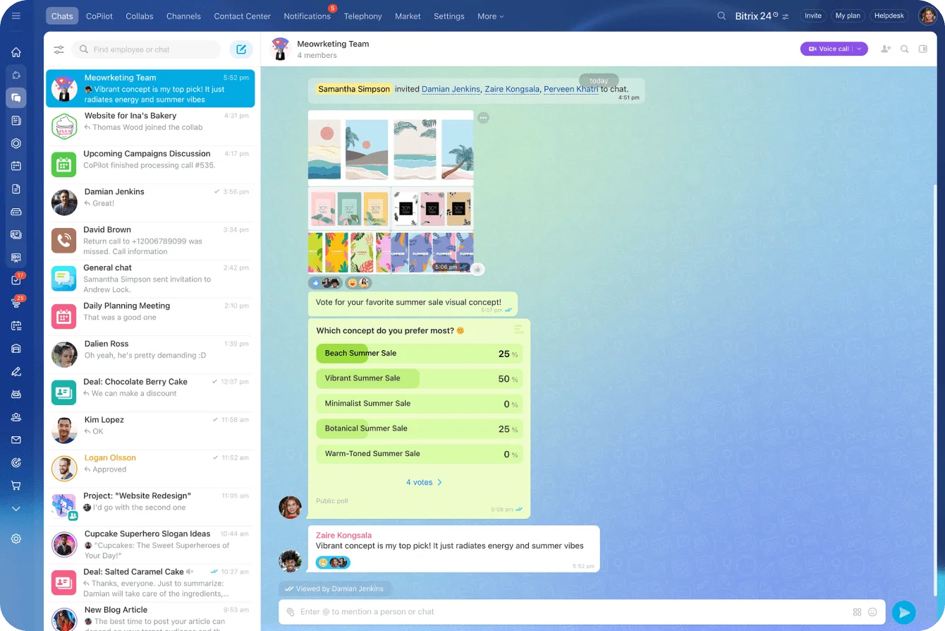 Messenger Bitrix24 garantit une communication rapide, productive et sécurisée, organiquement liée au reste de nos outils de collaboration et de CRM.
