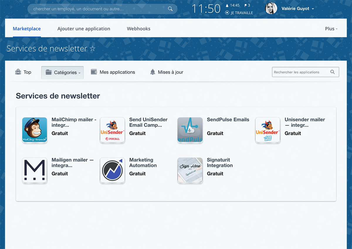 Bitrix24 peut être associé à plusieurs dizaines d'intégrations disponibles sur le Market Bitrix24. Vous pouvez aussi créer vos propres applications depuis le REST API.