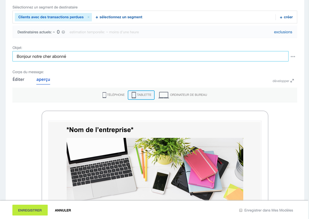 Vous pouvez envoyer en masse jusqu'à 1 000 000 d'e-mails par mois sans avoir à utiliser un service de marketing par e-mail payant. Utilisez l'un de nos modèles ou créez votre propre e-mail à partir de zéro, et enregistrez-le comme modèle pour une utilisation ultérieure.