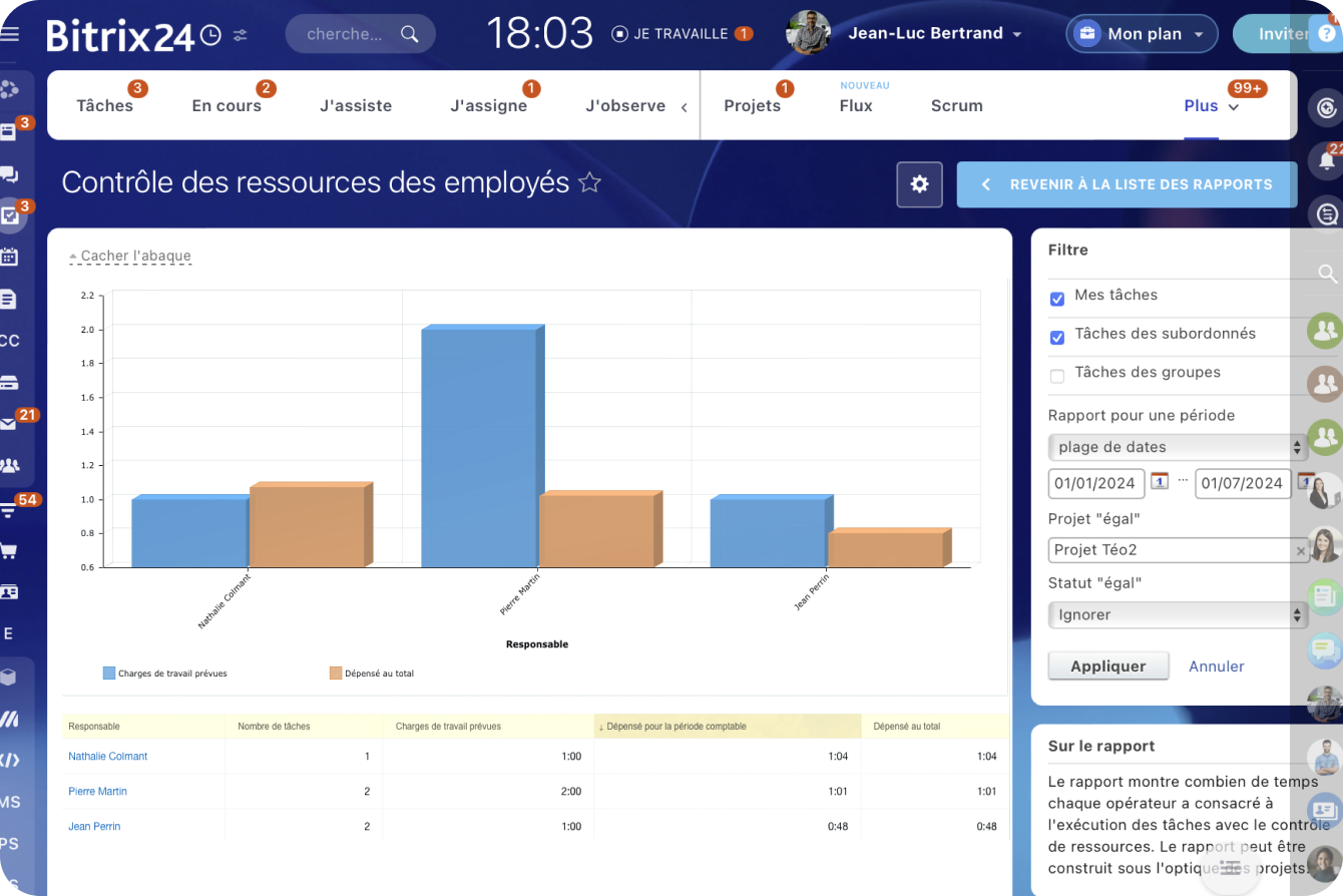 Bitrix24 vous permet de suivre le temps que vos employés consacrent à une tâche particulière et leur implication dans les projets. Ces données peuvent être utilisées pour assurer une gestion et une planification plus efficaces de la charge de travail des équipes.