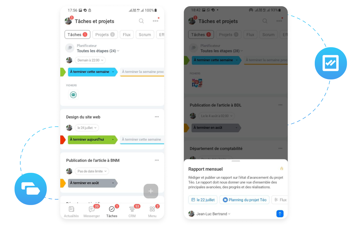 Vous n'avez pas besoin d'être devant votre ordinateur portable ou de bureau pour suivre le travail de votre équipe. Bitrix24 vous informera de toute activité liée aux tâches, ce qui vous permettra de réagir rapidement.