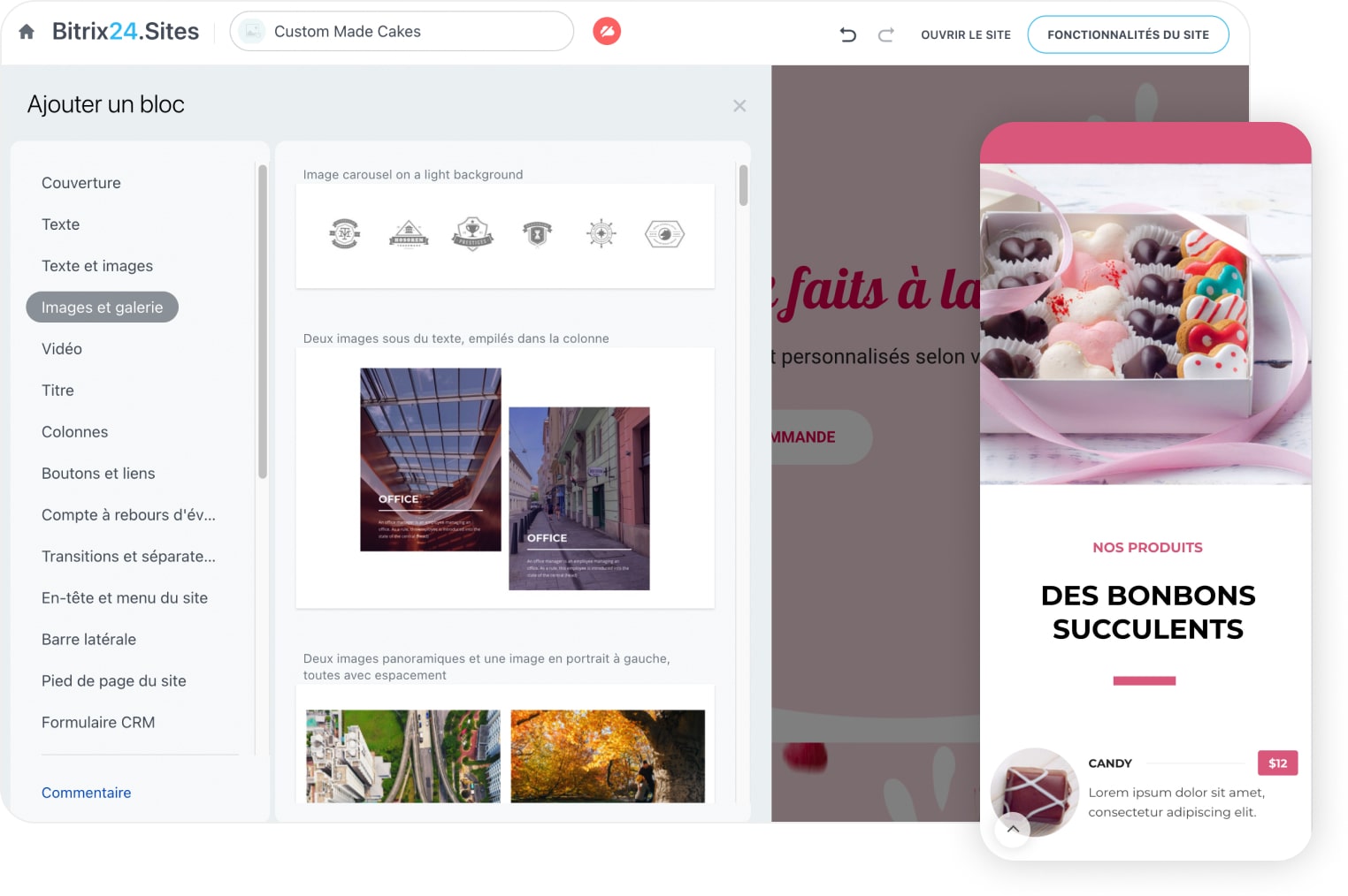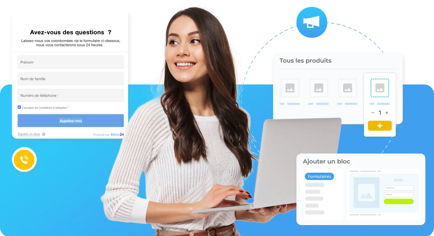 Utilisez notre constructeur de sites Web intuitif et sans code pour créer de beaux sites, des pages de destination et des boutiques en ligne entièrement intégrées aux outils de marketing en ligne et CRM de Bitrix24.