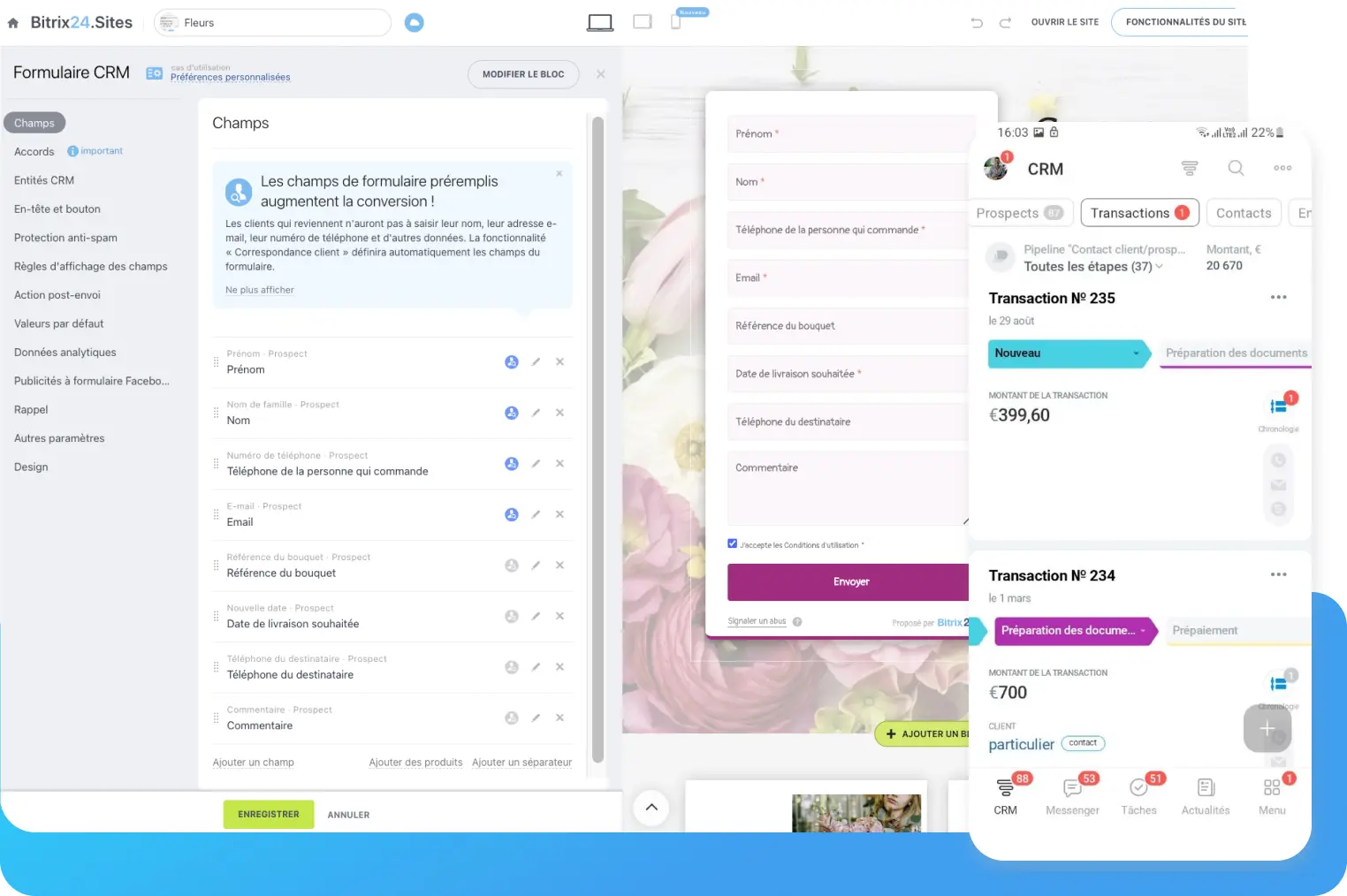 Tous les sites Web créés par Bitrix24 sont 100 % adaptés aux appareils mobiles, réactifs et dotés d'outils de commerce mobile.